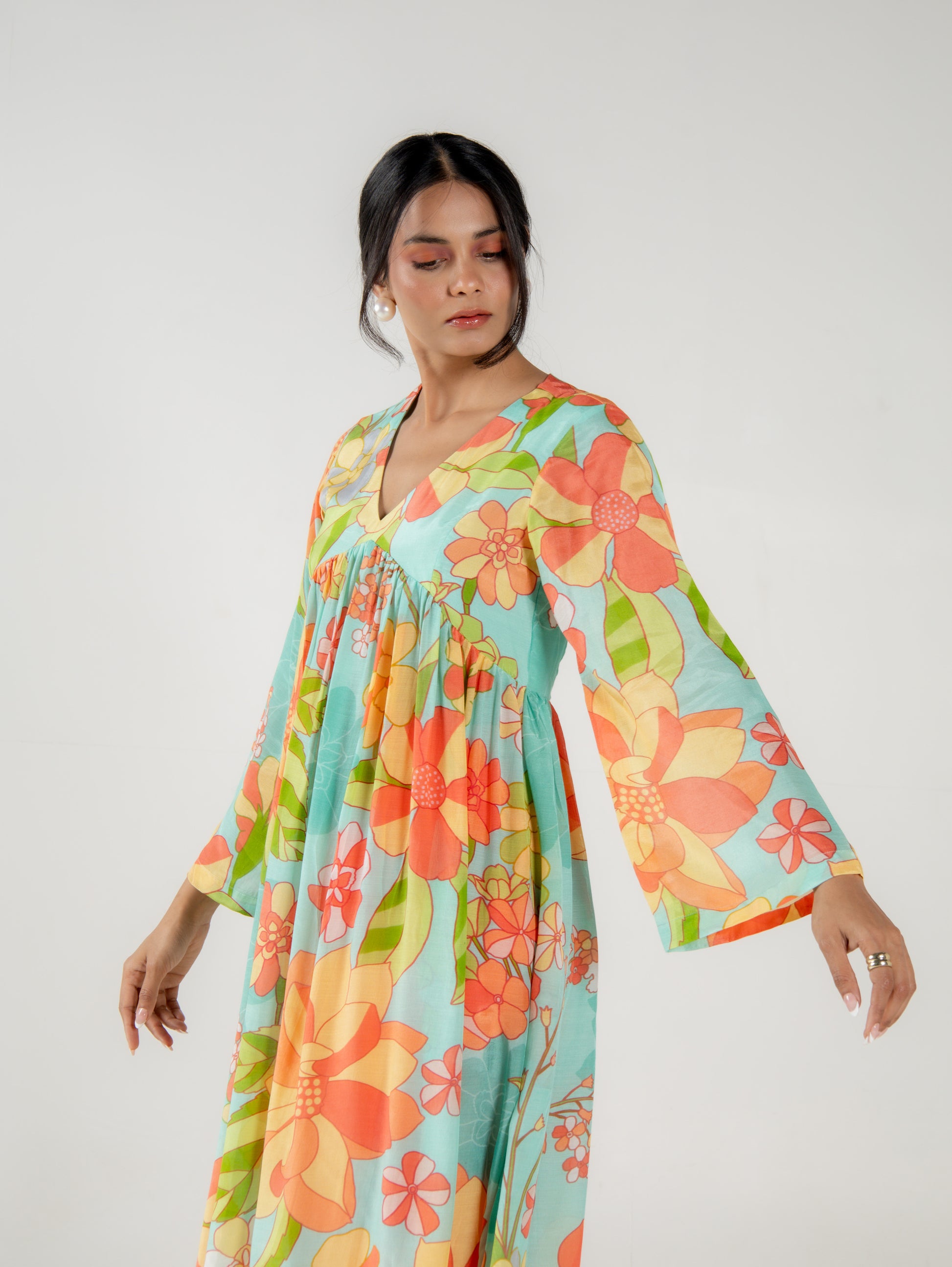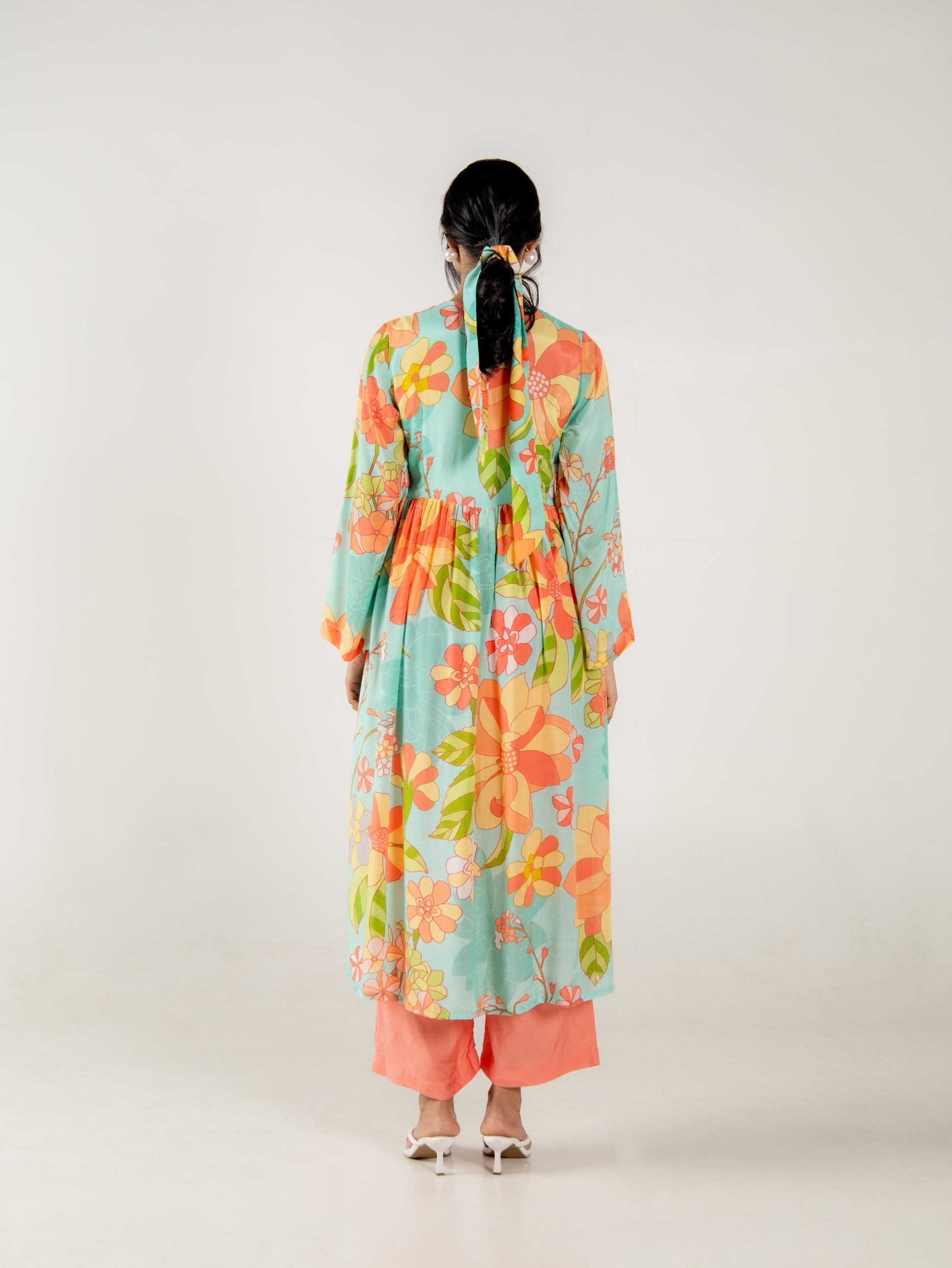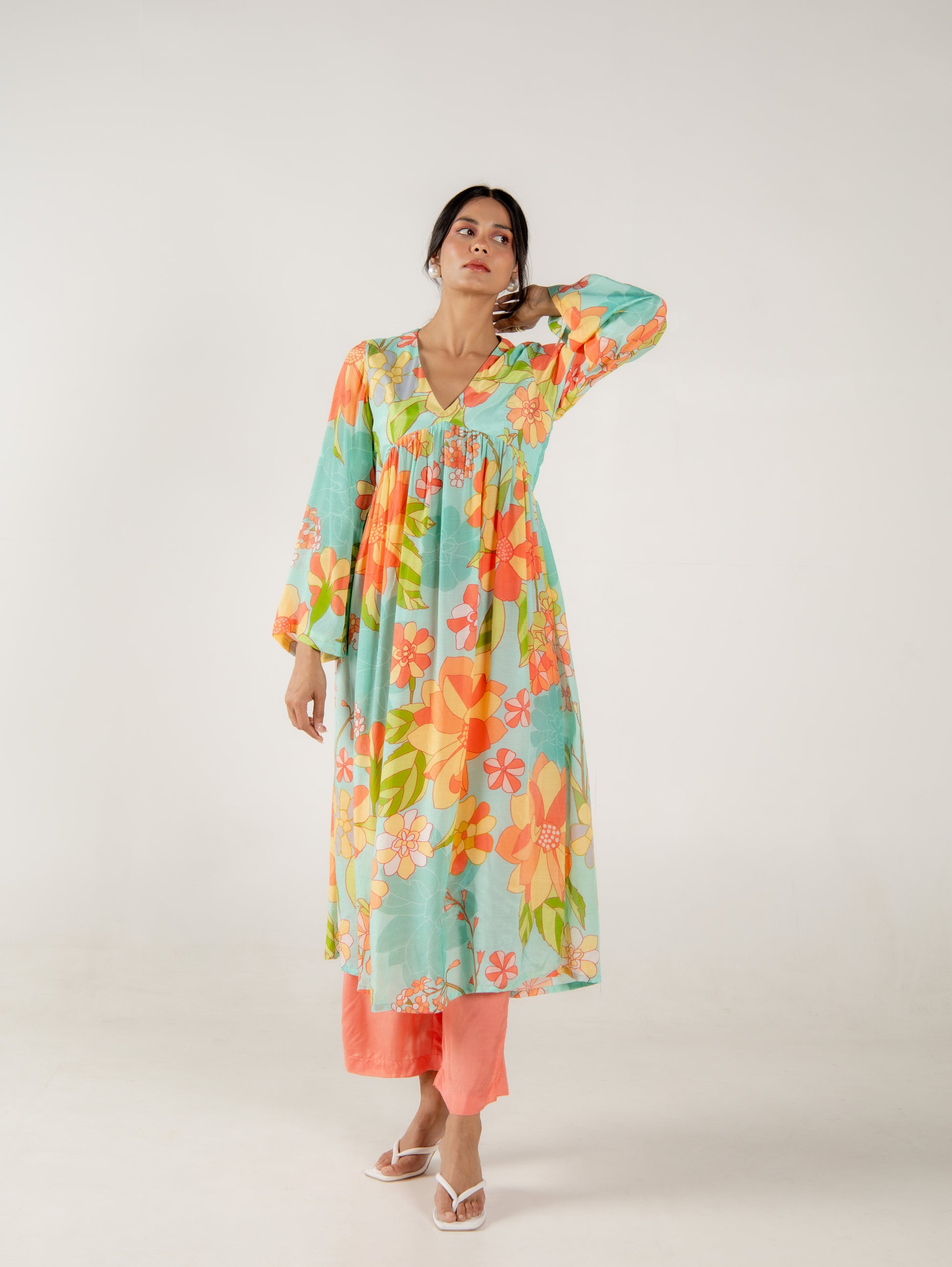 Full Sleeve V-Neck kurta with solid coloured pants. Handcrafted in cotton silk fabric in our Chicory print.