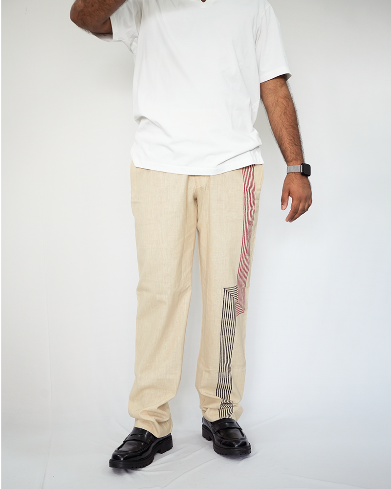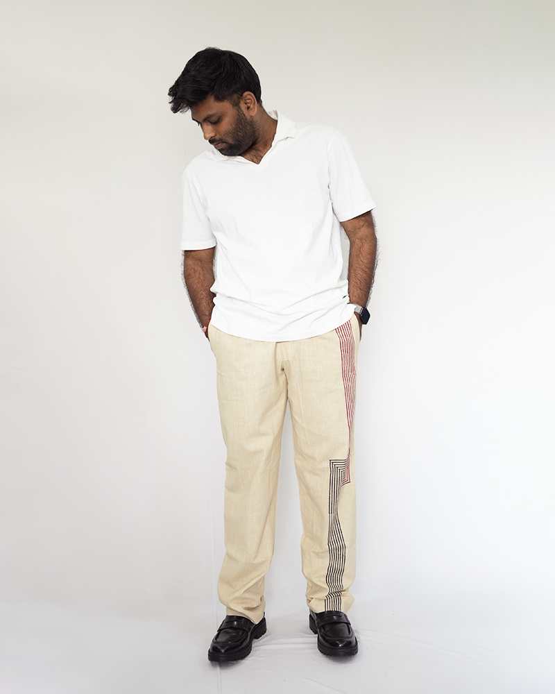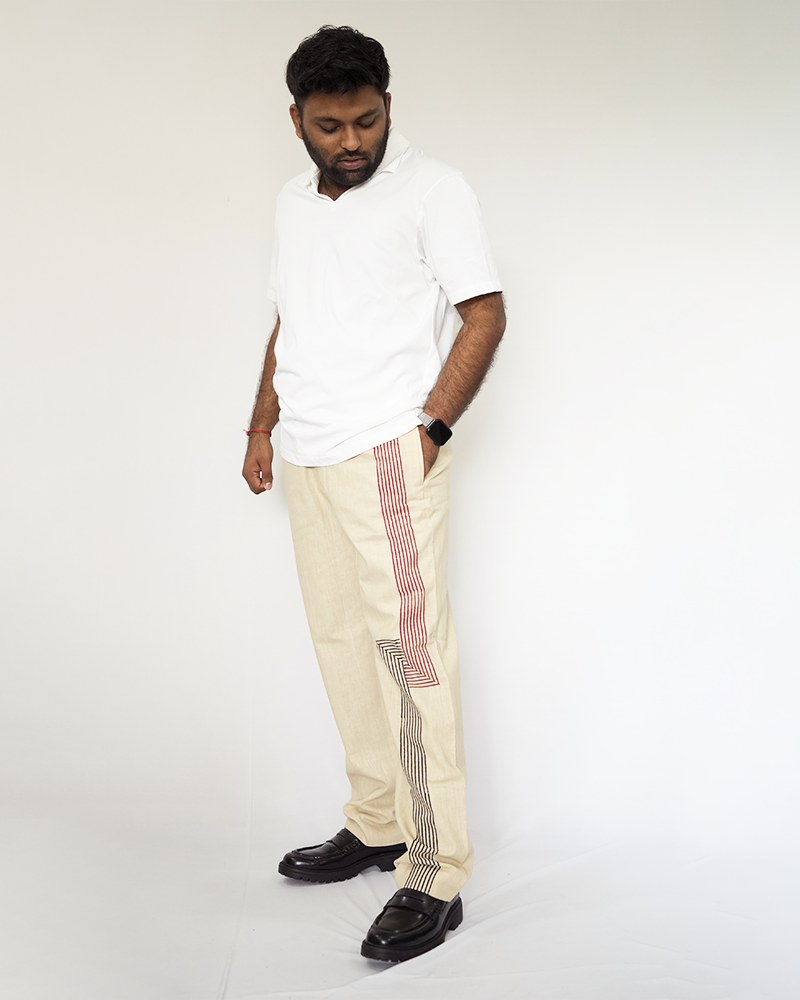 If comfort and style were in a perfect harmony, it would result into the creation of this trouser made with finest handwoven cotton fabric. The block print detail at the front adds a touch of artisanal charm, elevating these trousers, making them a great option for a day to night transitional piece.