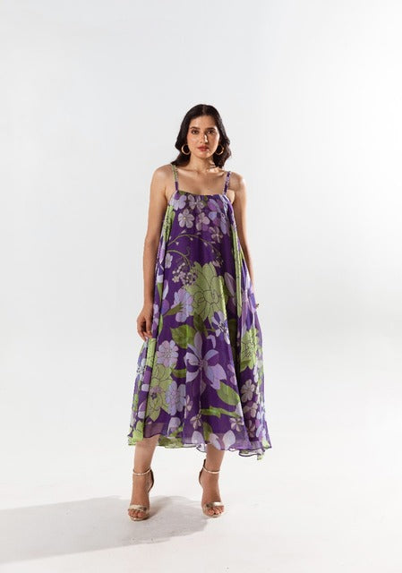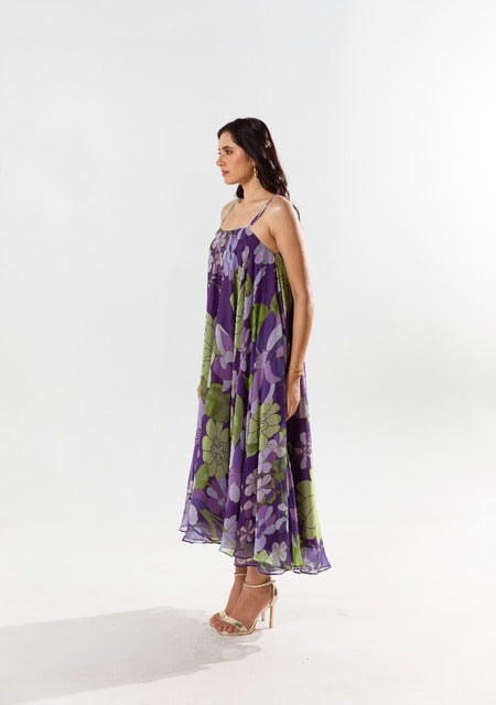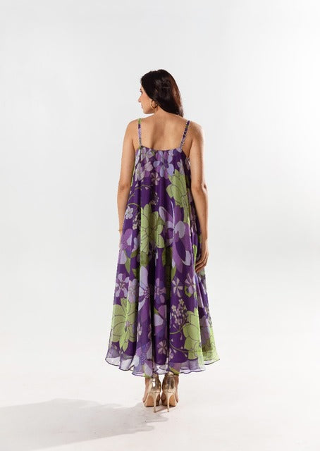 Single strap long dress with easy going flare is made with sustainable chiffon adorned exquisitely with white mini pearls. Purpose: Festive/ occasion wear