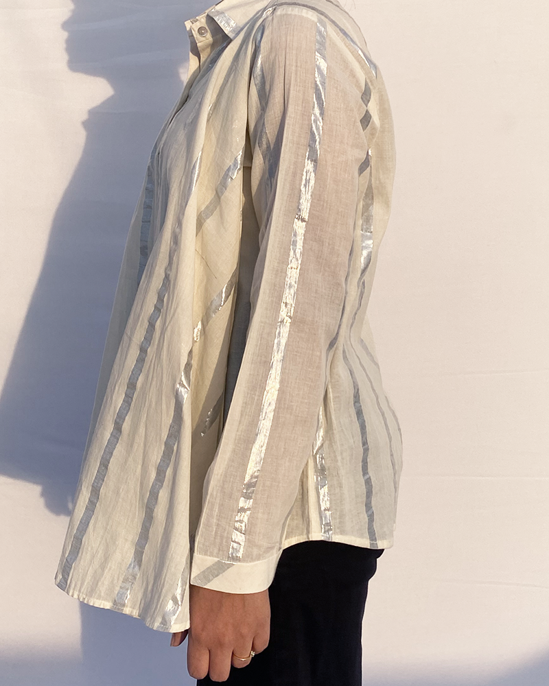 The butterfly shirt is a pure cotton shirt with silver striped accents. Its flared front adds a touch of flair, perfect for making a statement on any occasion. Versatile enough to complement both Western and Indian attire, this shirt offers endless styling opportunities.