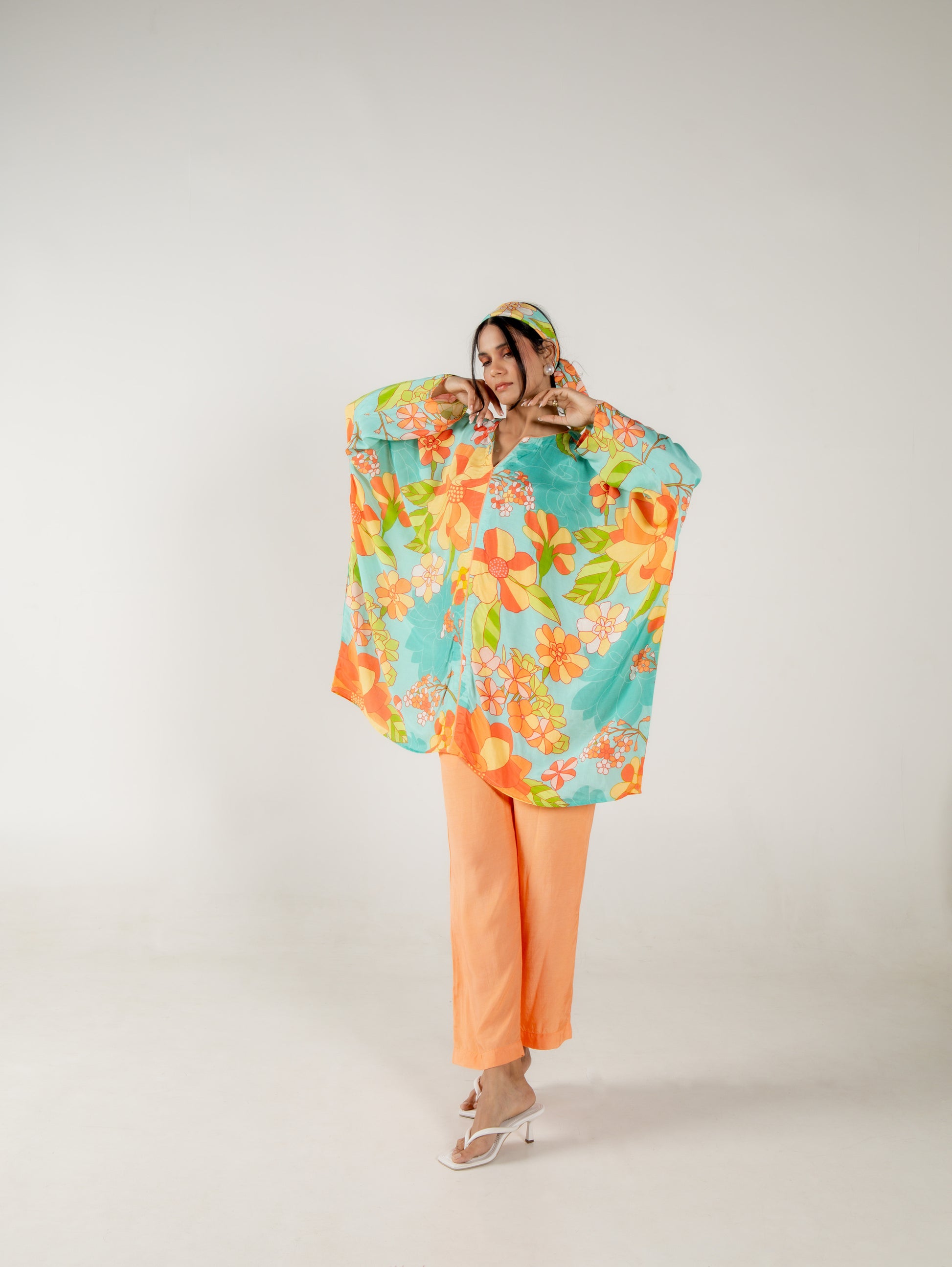Full sleeve anti-fit short kurta, Paired with solid straight pants. Handcrafted in cotton silk in our chicory print.