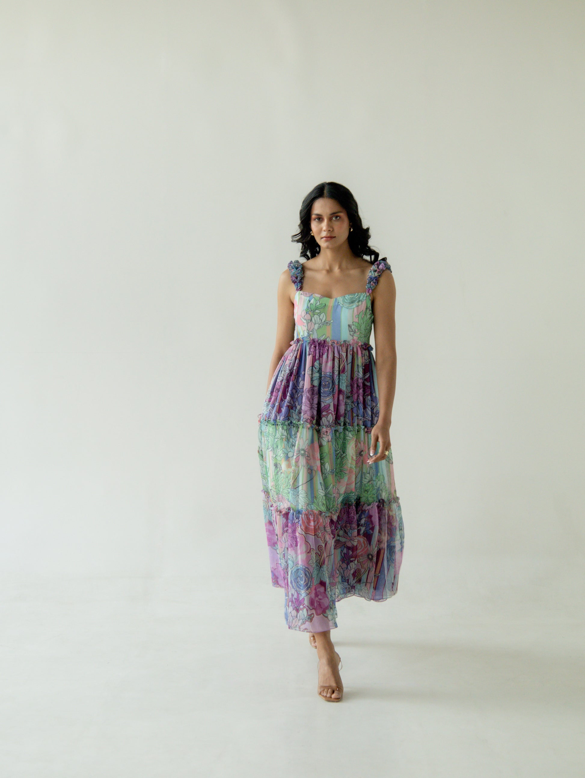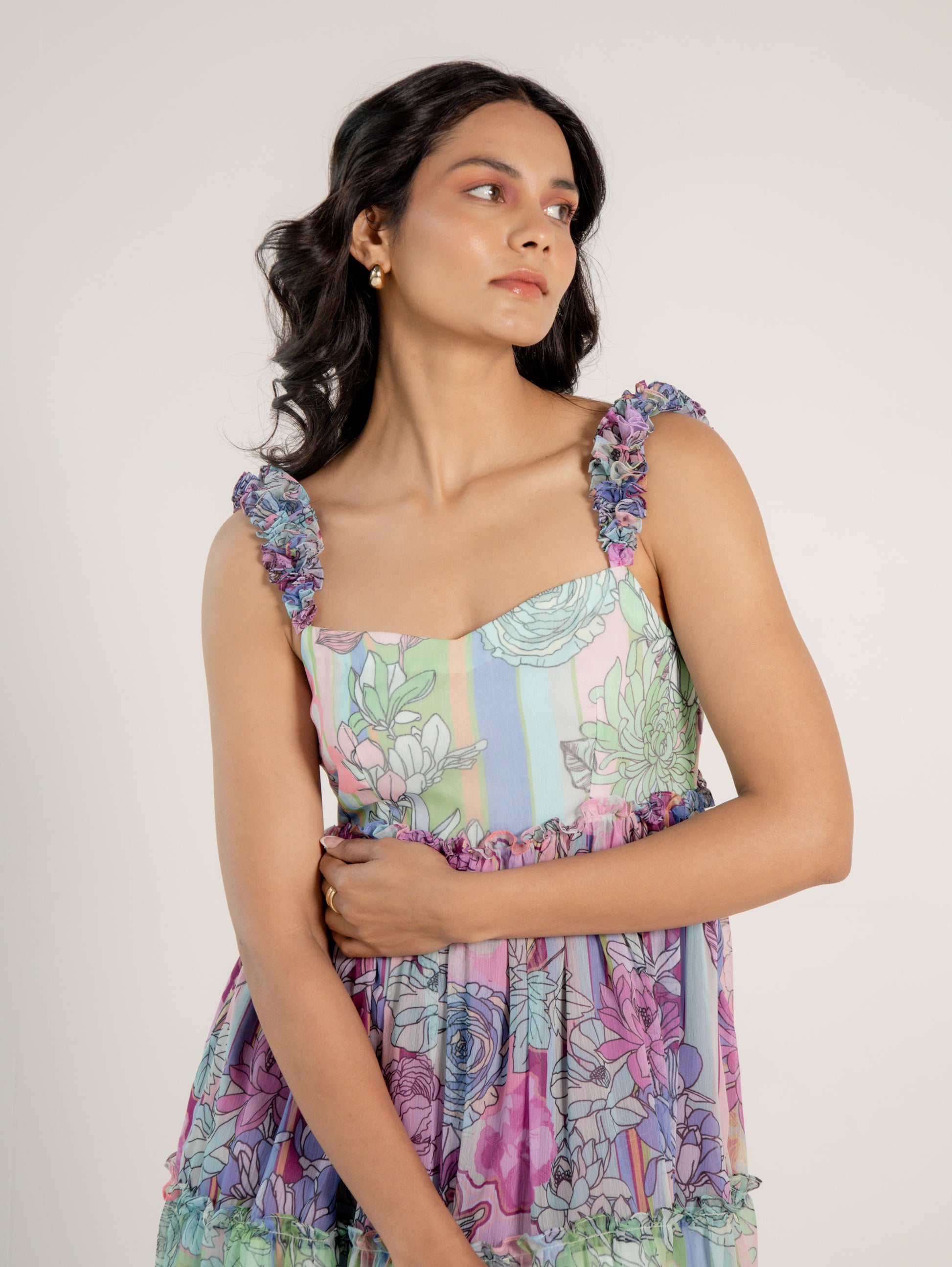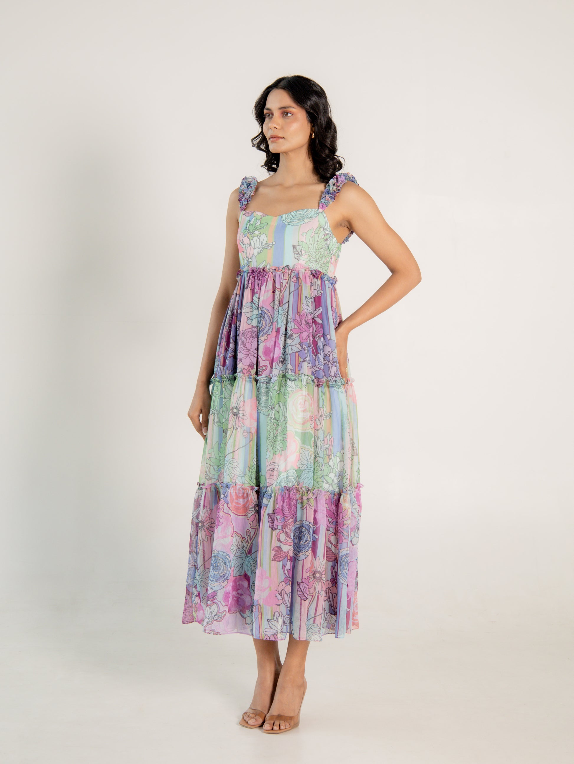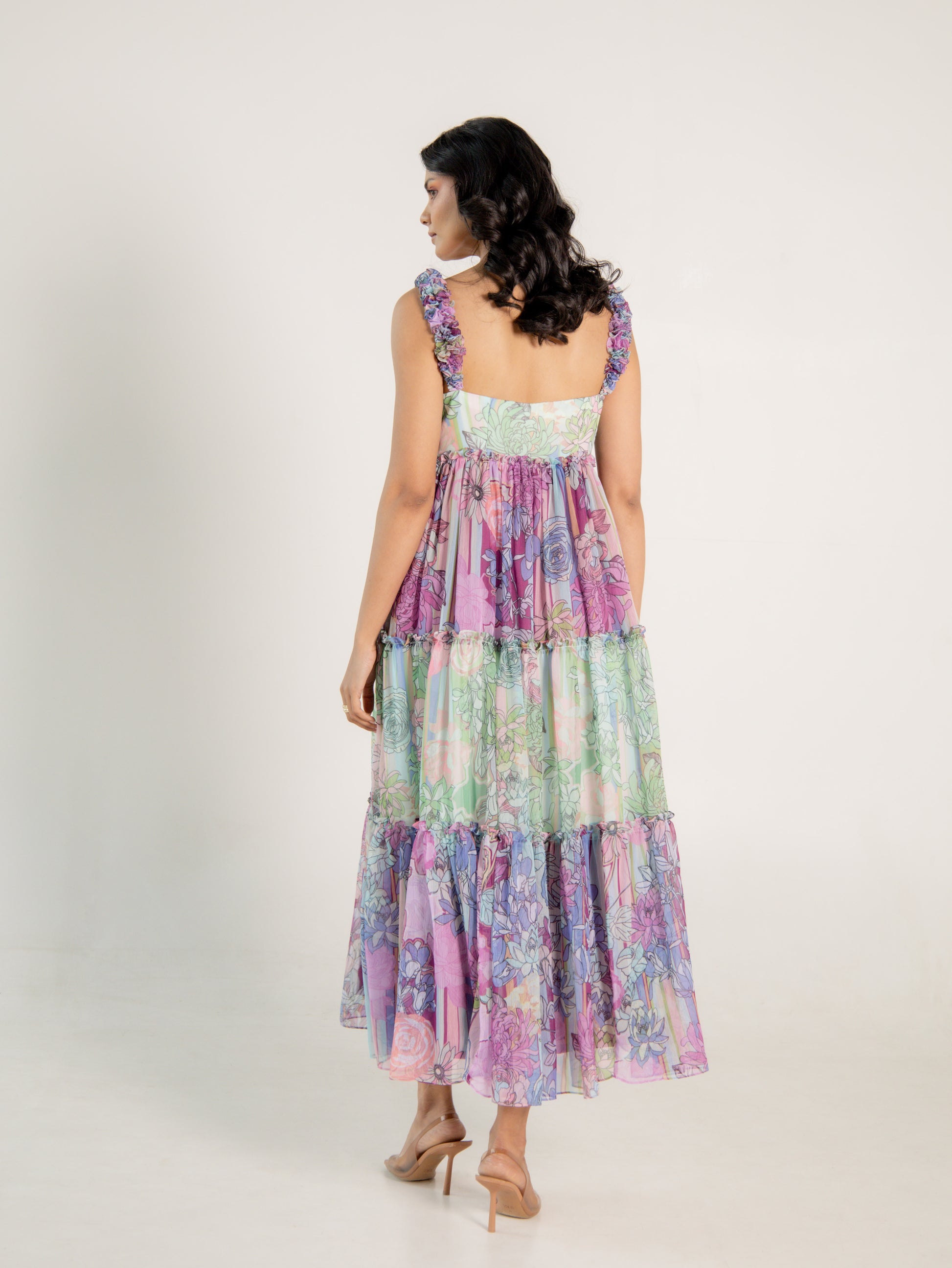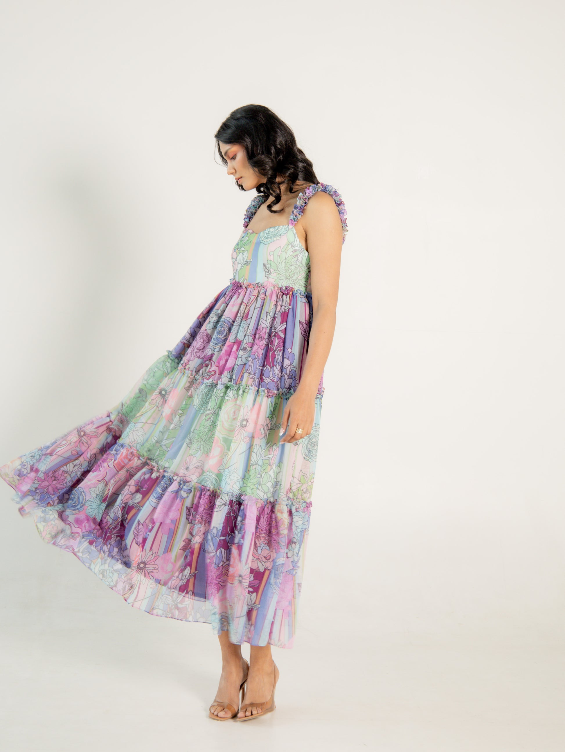 Beautiful three tiered dress with ruffled straps and mix matched combination of Fern & Fay print, handcrafted in our recycled chiffon fabric.