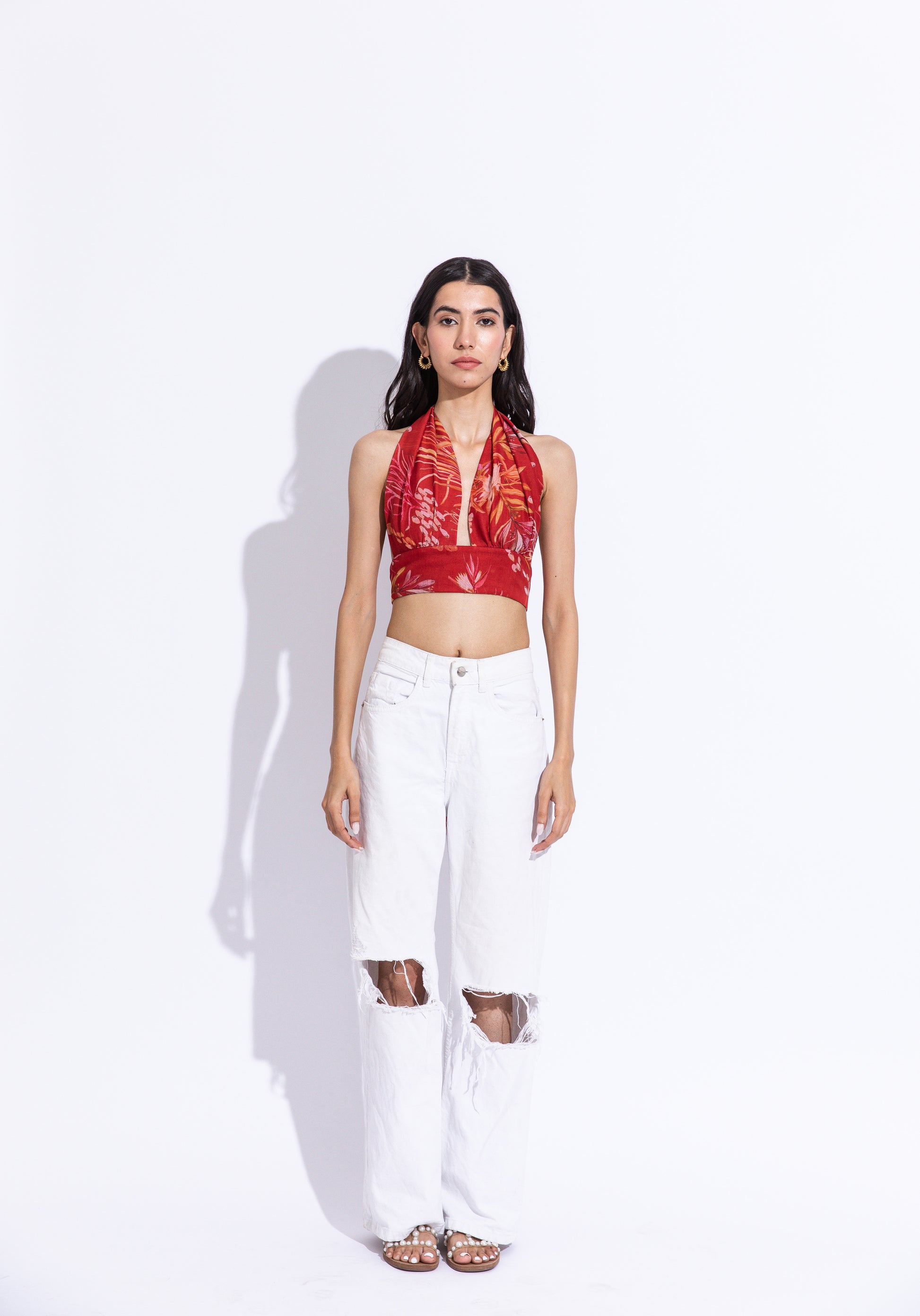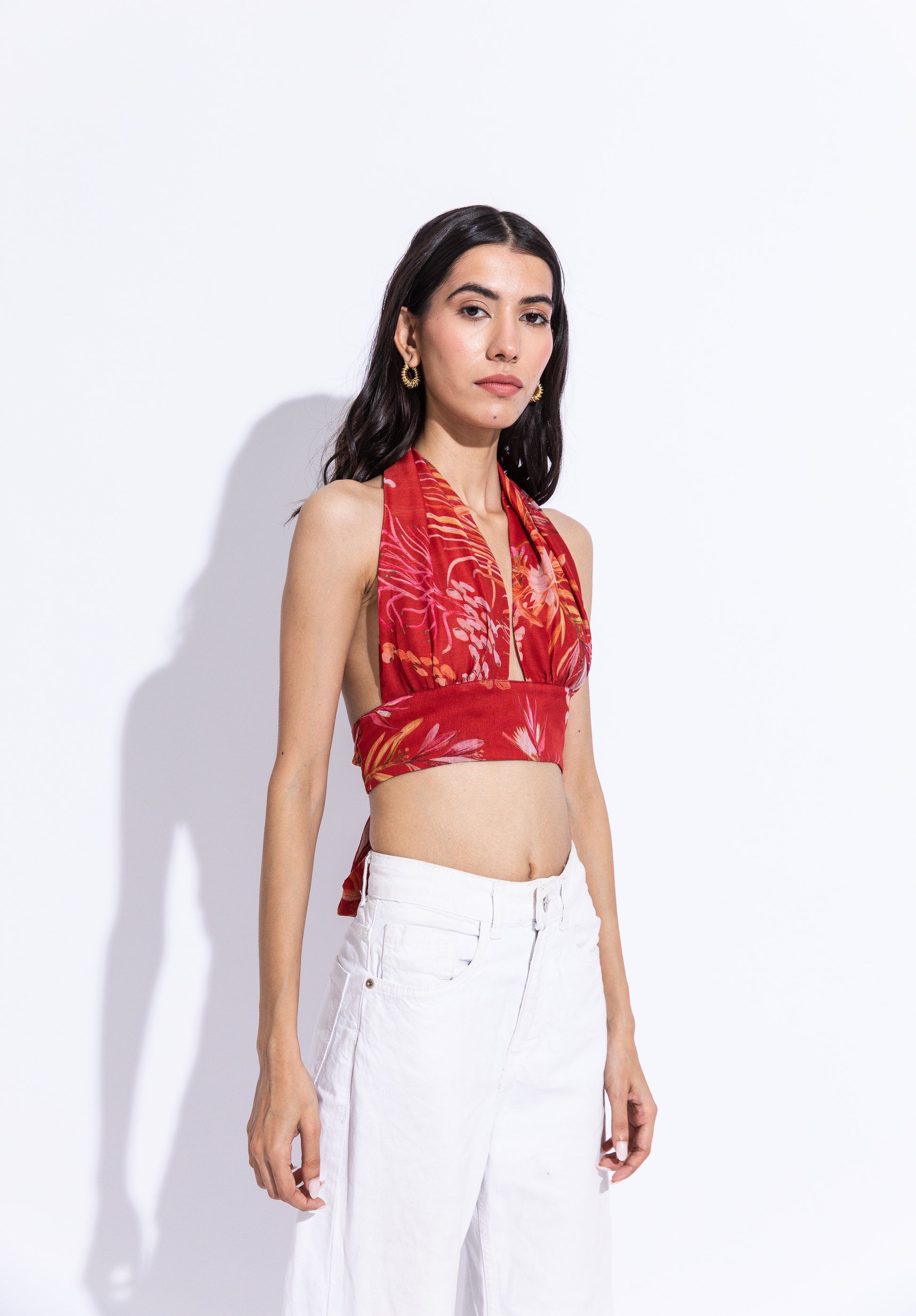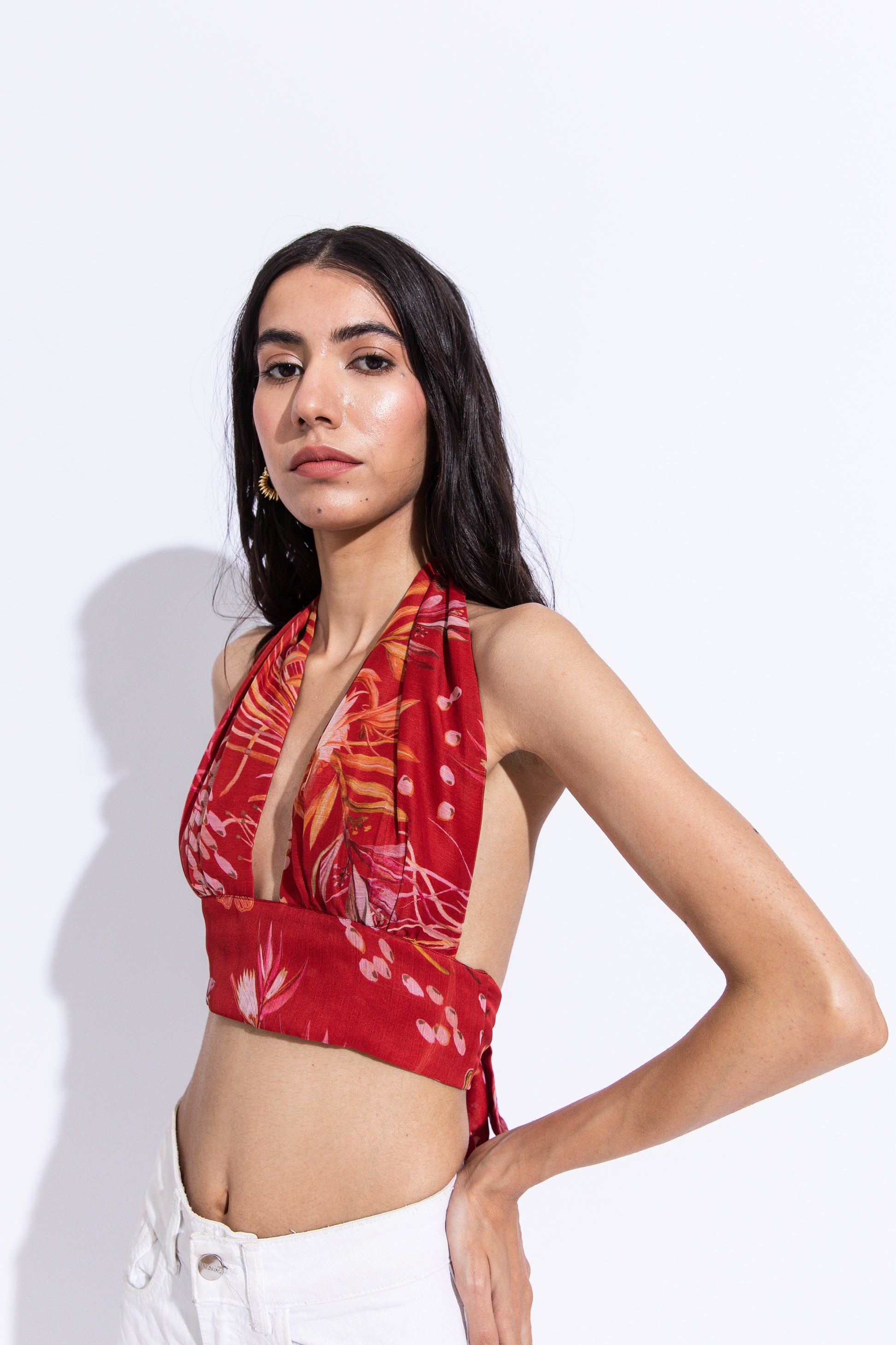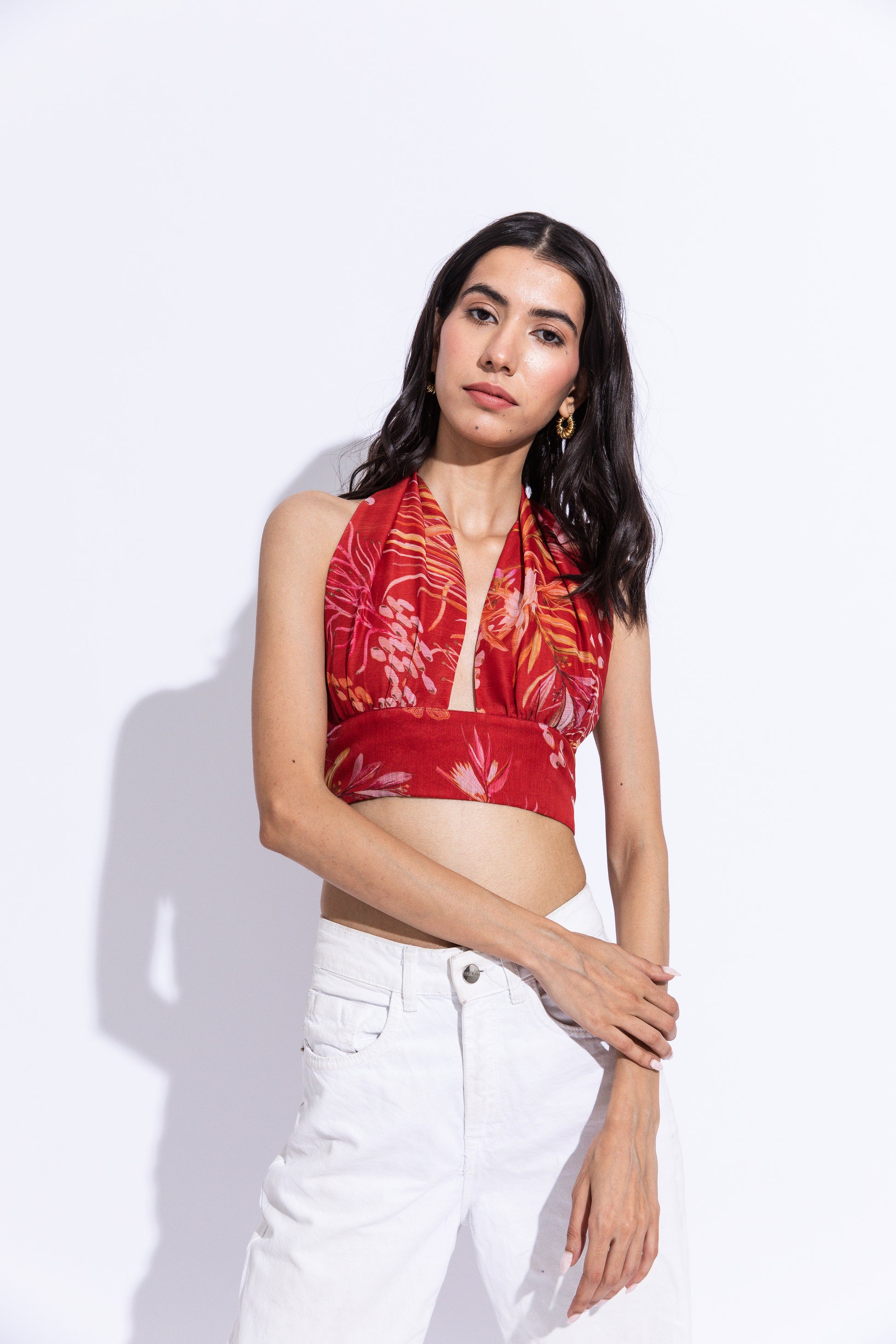 Drape top with tie up detail, handcrafted in our Amaryllis print in sustainable chiffon fabric.
