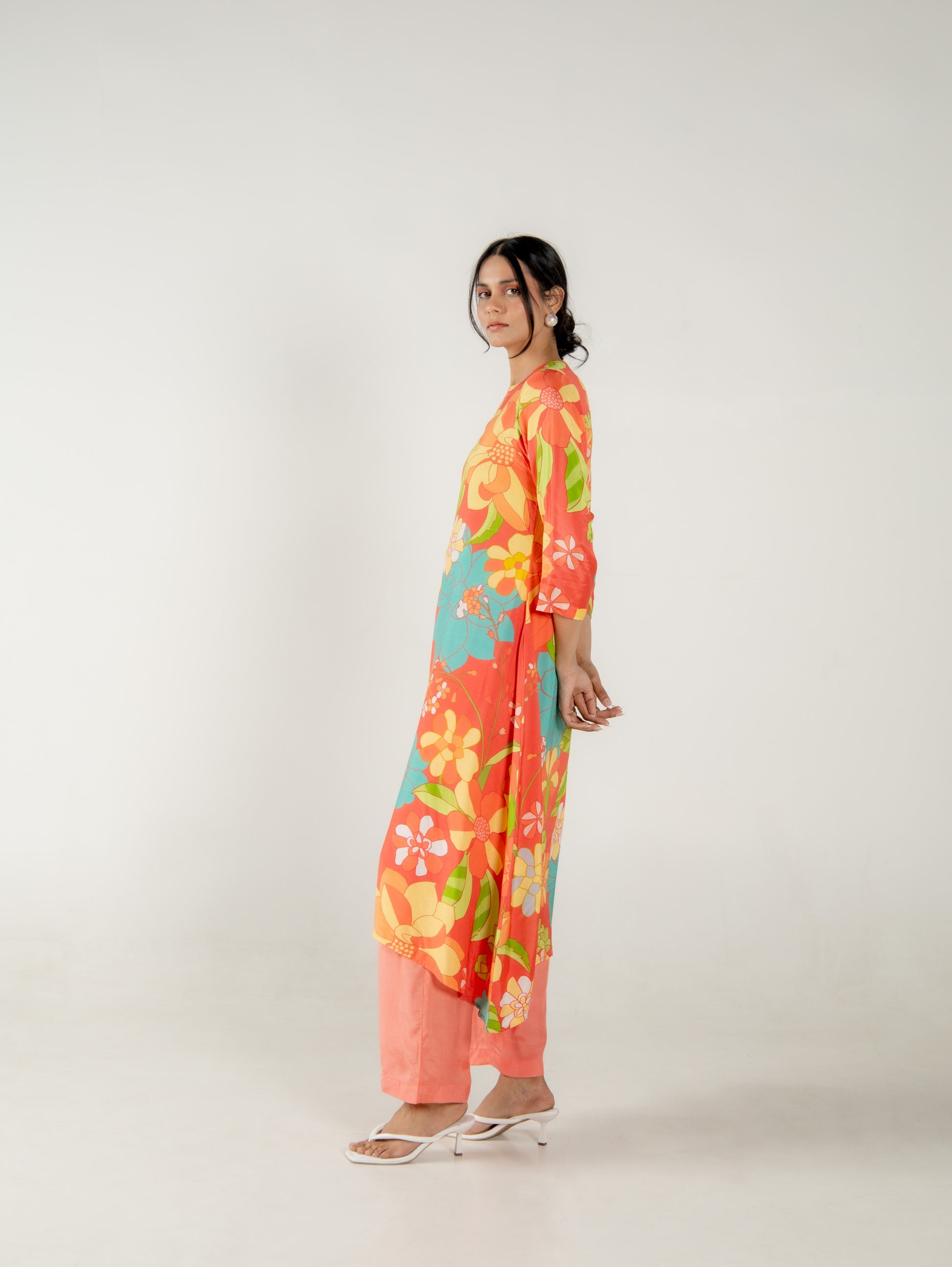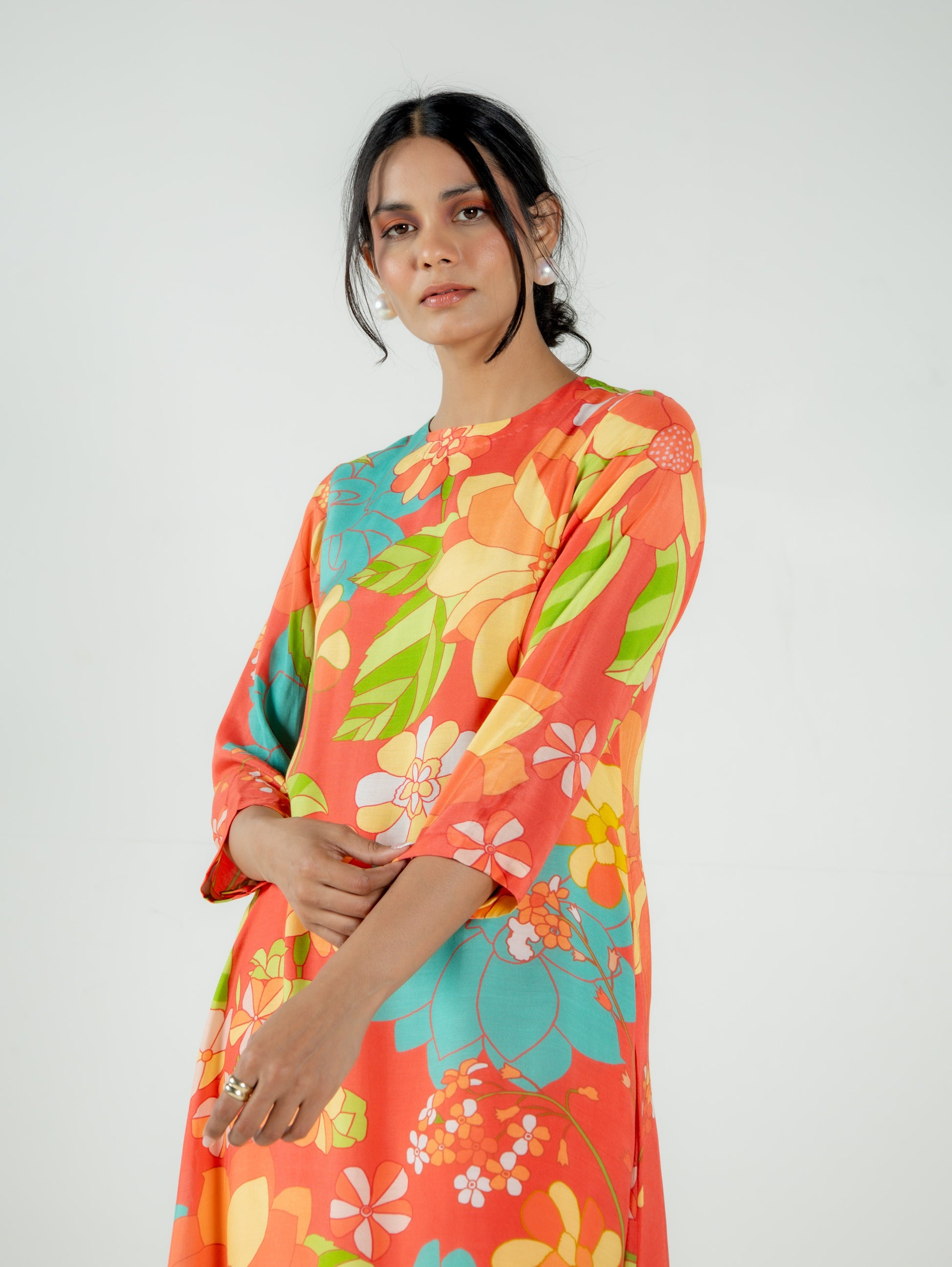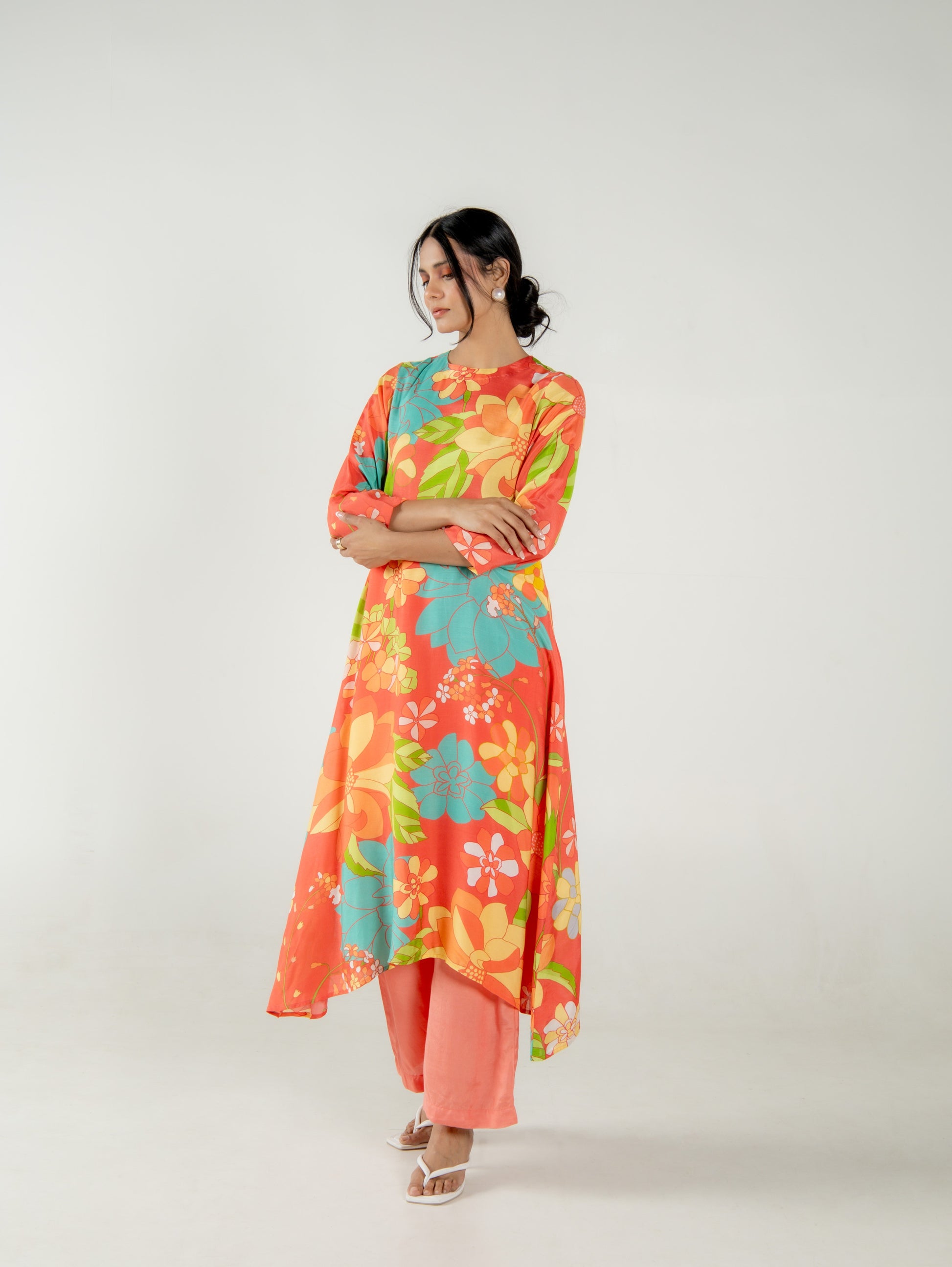 Simple Flared kurta with elbow length sleeve and scoop neckline in our Prickly print paired with solid coloured pants. Handcrafted in cotton silk.