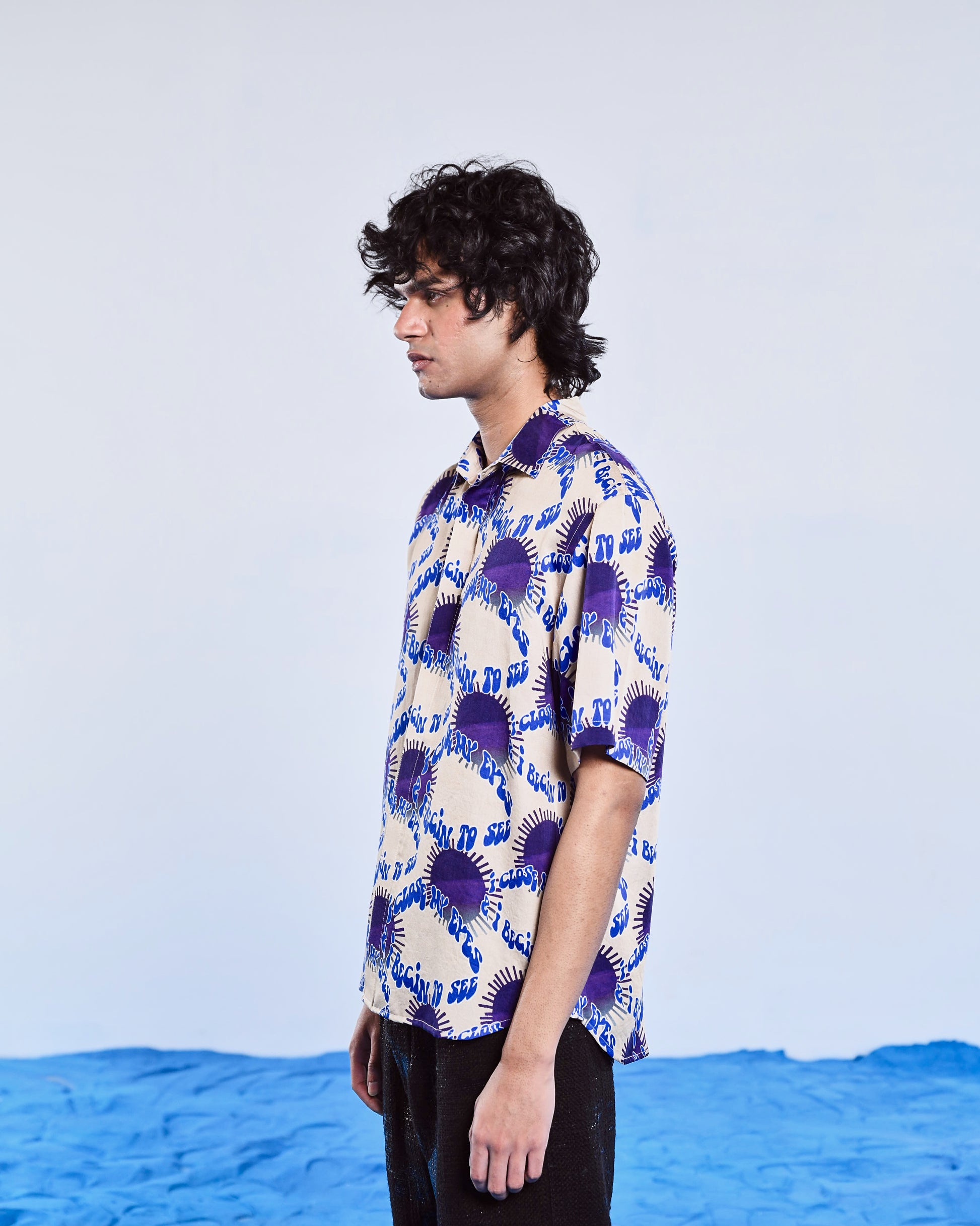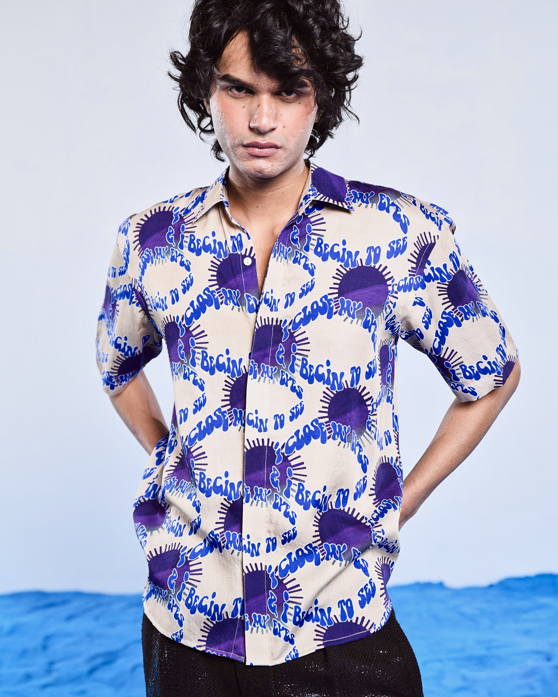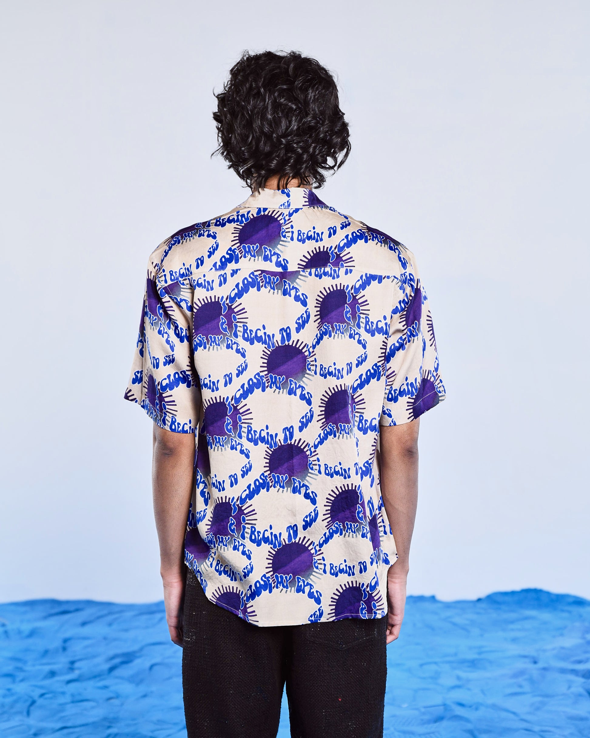 Featuring a half-sleeve shirt made in Lenzing satin with an artwork of repeated print of lyrics of Ben Boehmer of the iconic song in eye shape which resonate with dreams and fantasy world, the versatility of this product makes it a wardrobe essential.
