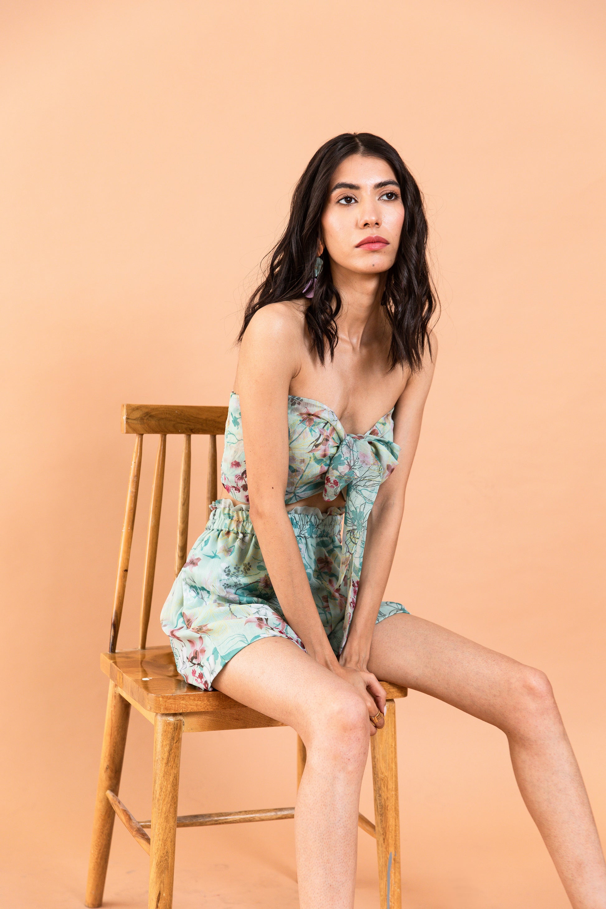 Smocked tube top with tie-up detail for better fit and comfort paired with comfort fit shorts, handcrafted in our catmint print in sustainable chiffon fabric.