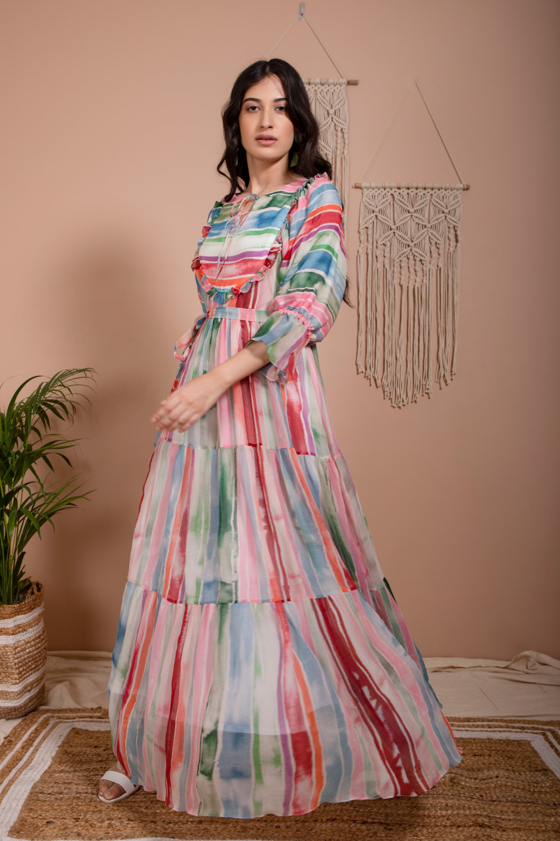 Loose fit tier dress with back and neck ruffled detailing. Handcrafted in recycled chiffon fabric in India.