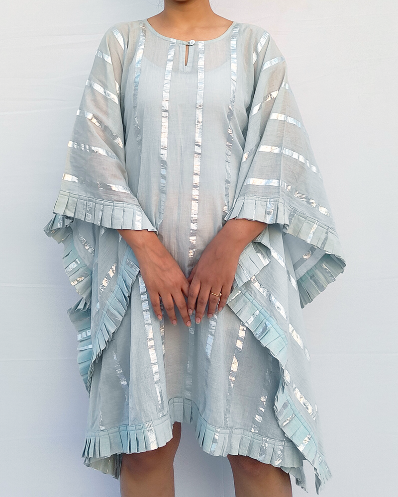 The kaftan is handcrafted in a pure cotton fabric with silver accents. The pleated hem adds a subtle yet remarkable touch, elevating its appeal. Could effortlessly transition between traditional settings and casual daywear. Let it it become a staple in your wardrobe and add a touch of refined charm to your collection.