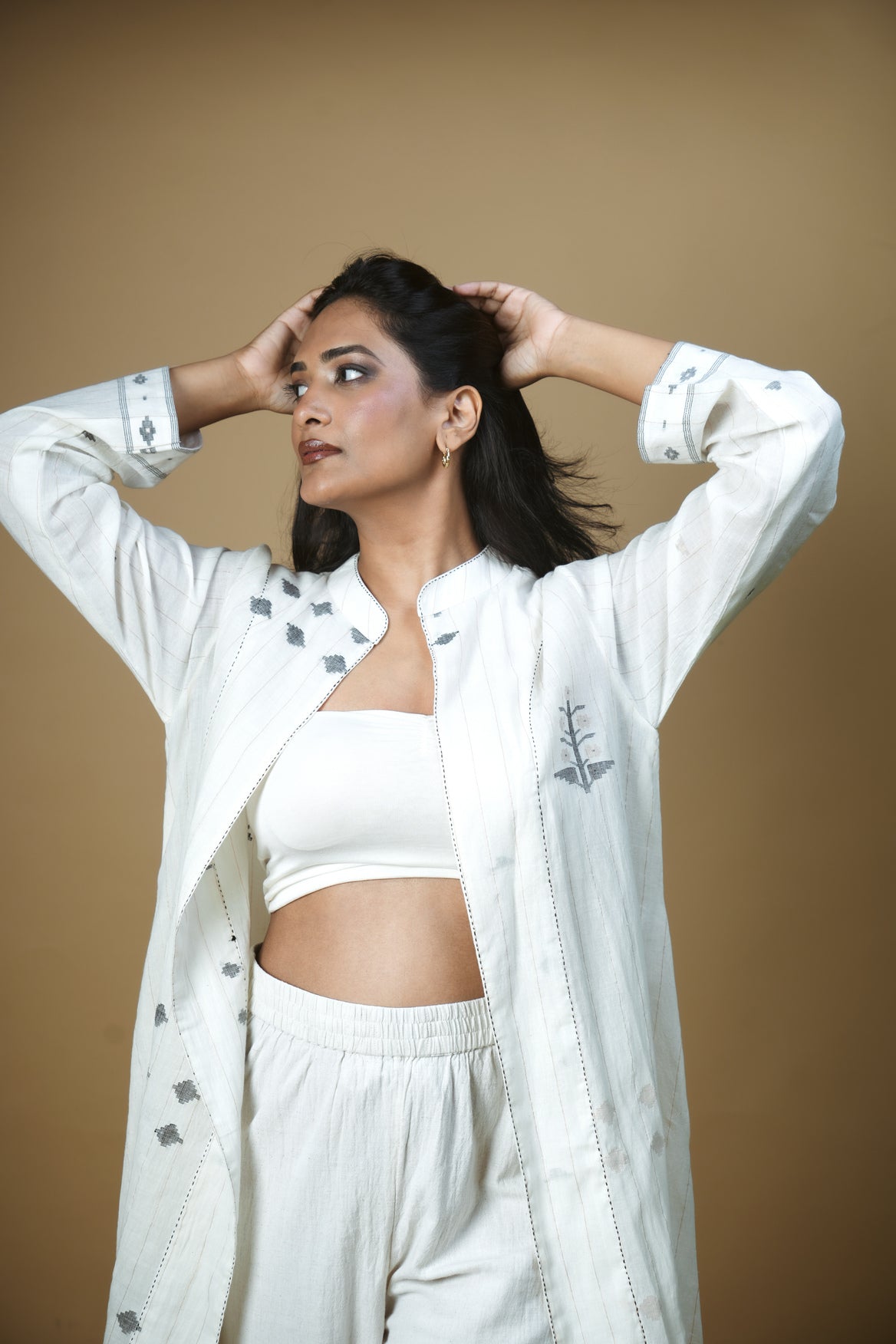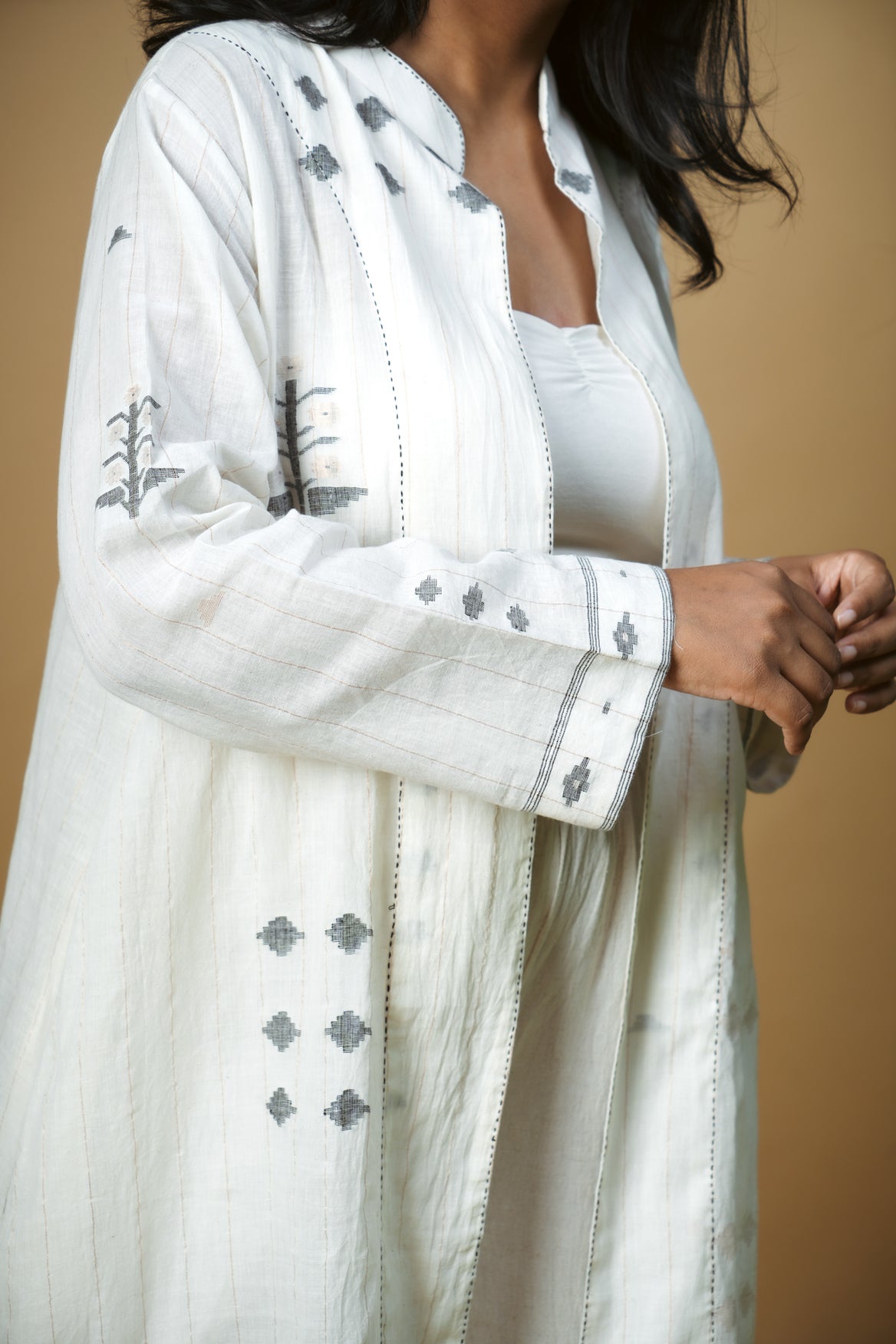 This overlay is made from fine, handwoven cotton Jamdani. It showcases the traditional jamdani motif and has three-quarter sleeves with detailed Kantha hand embroidery at the collar and in-face finishing. It does not come with an attached lining.
