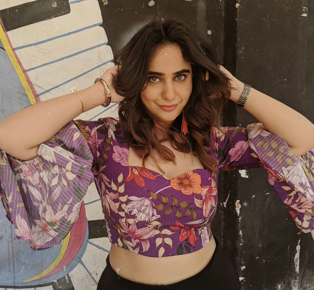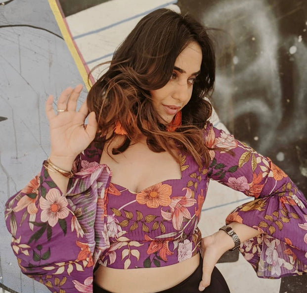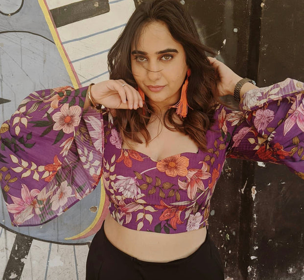 Sweetheart neckline crop top with flared sleeves, Handcrafted in our periwinkle print in cotton silk fabric.