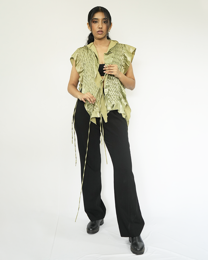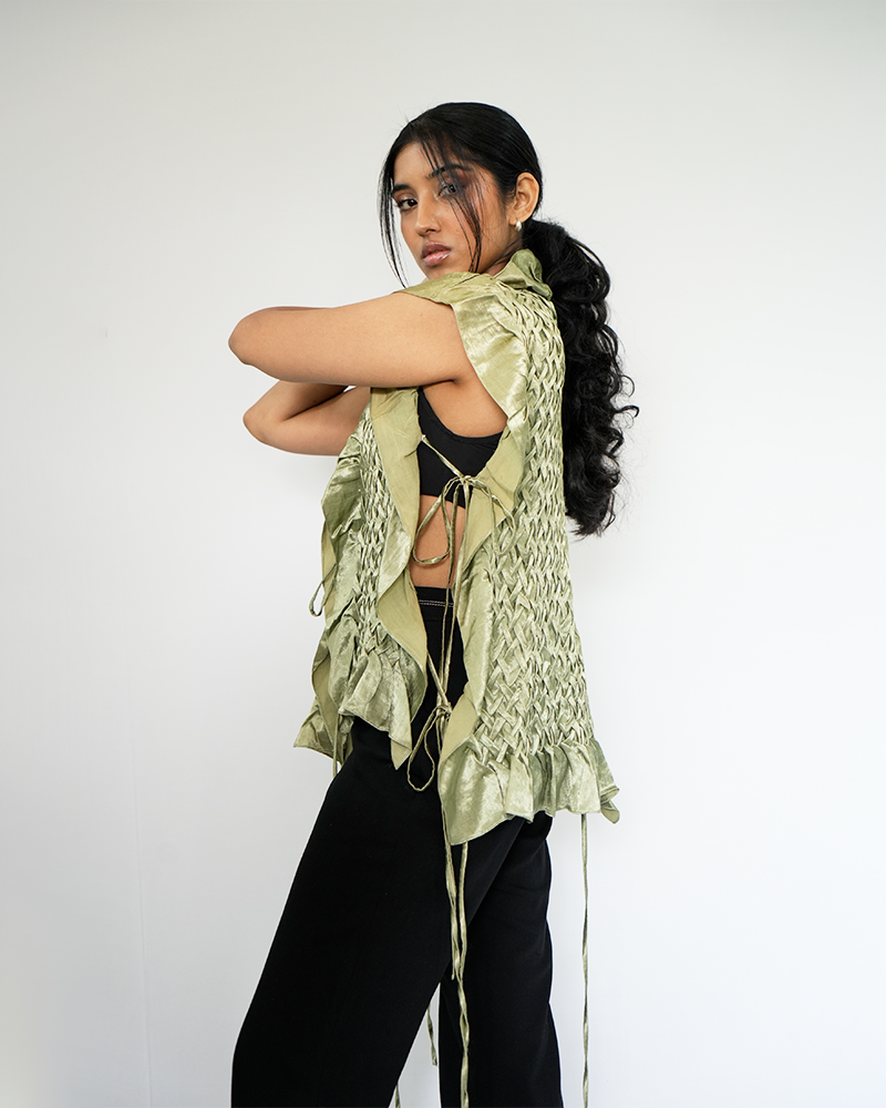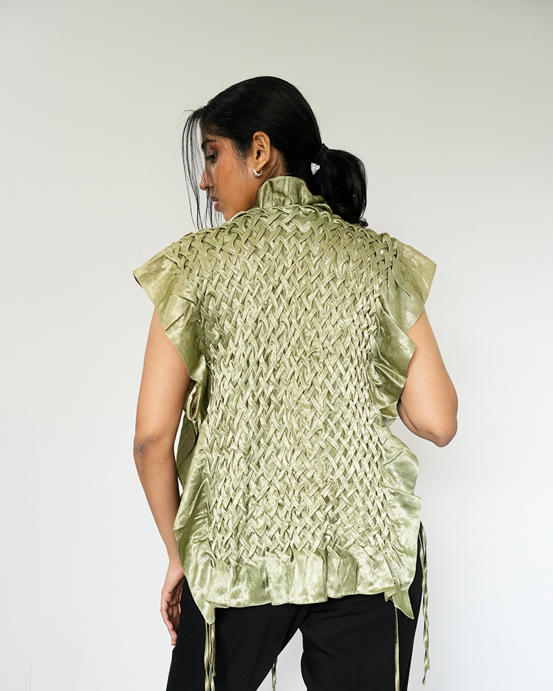 Behold our mighty, malleable Bib, a hand-smocked entity that offers an alternate to your formal blouse. Fierce and unconventional, our Phoenix Mashru Bib exudes an aura of otherworldly knowledge, wisdom and intuition.