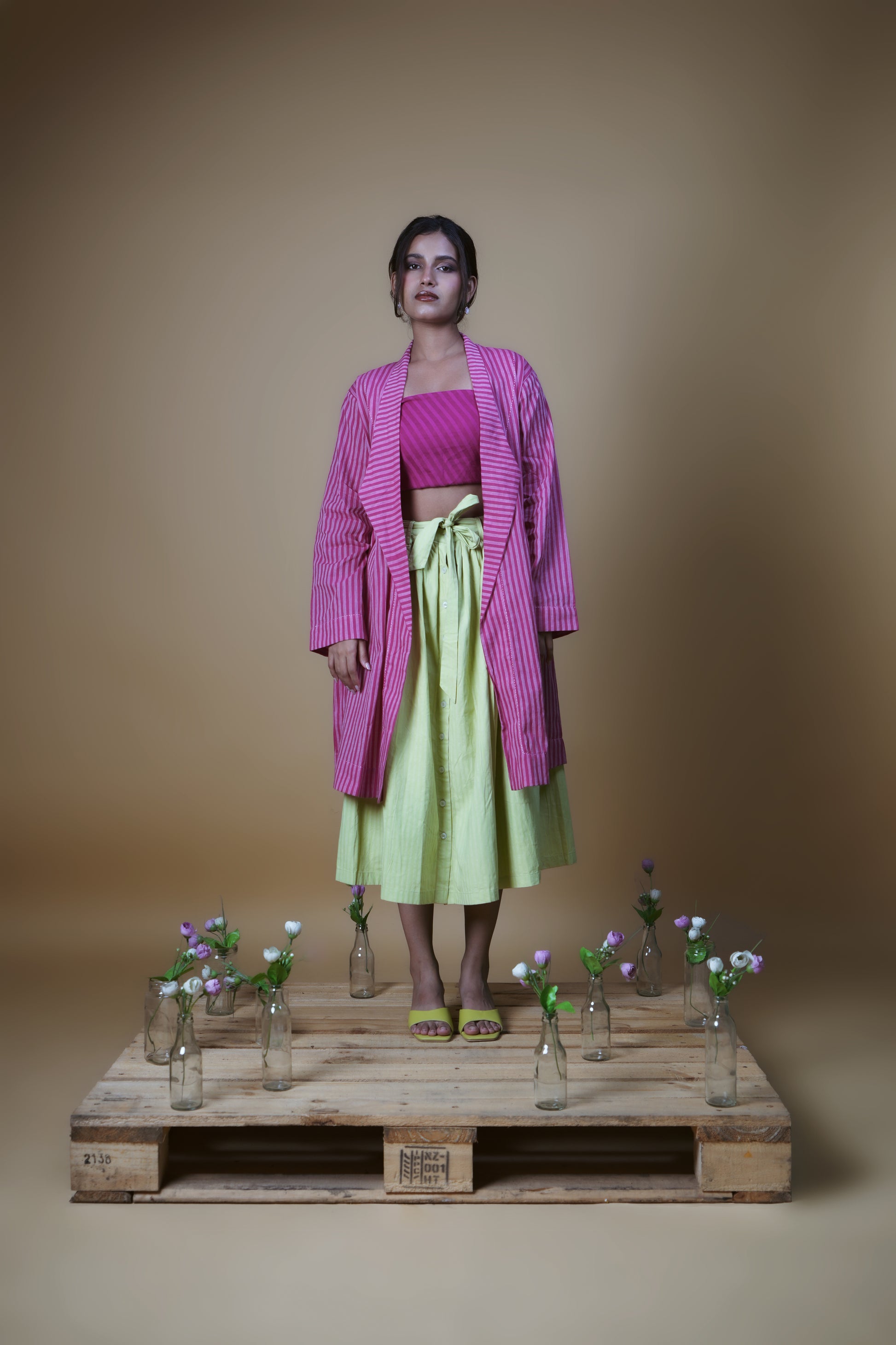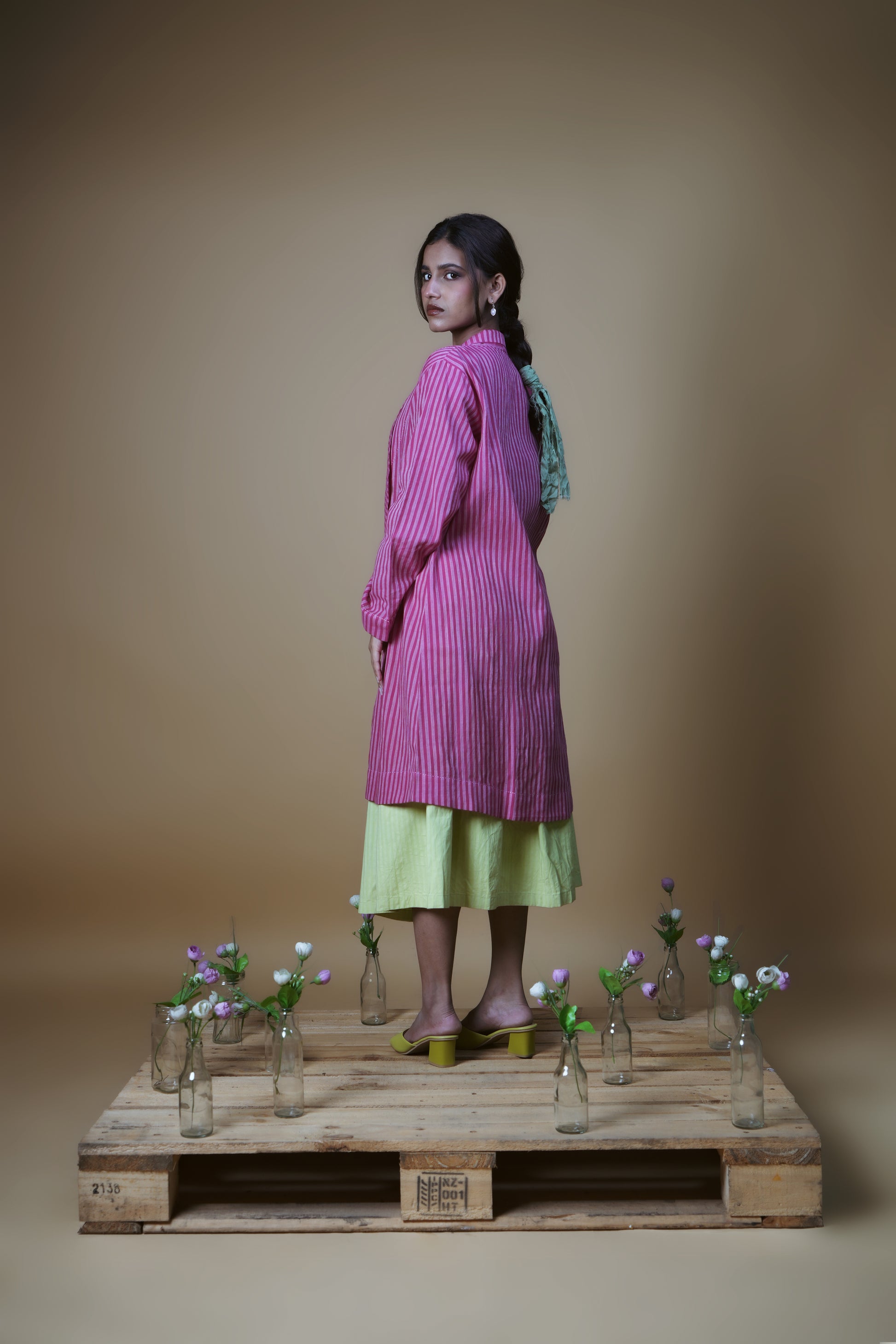 This striped overlay is crafted from fine, handwoven cotton Jamdani. It features a loose lapel and three-quarter sleeves with detailed Kantha hand embroidery.