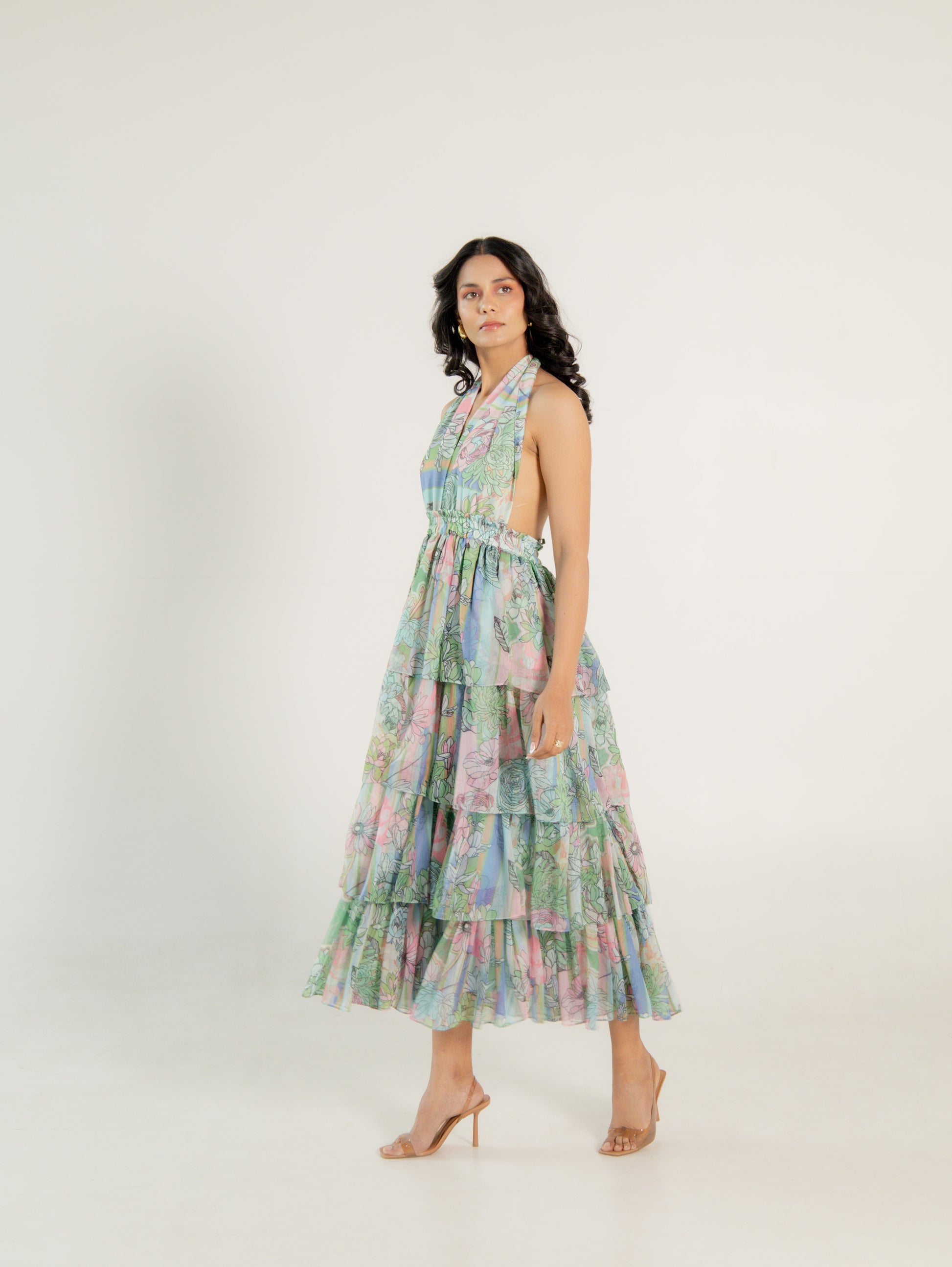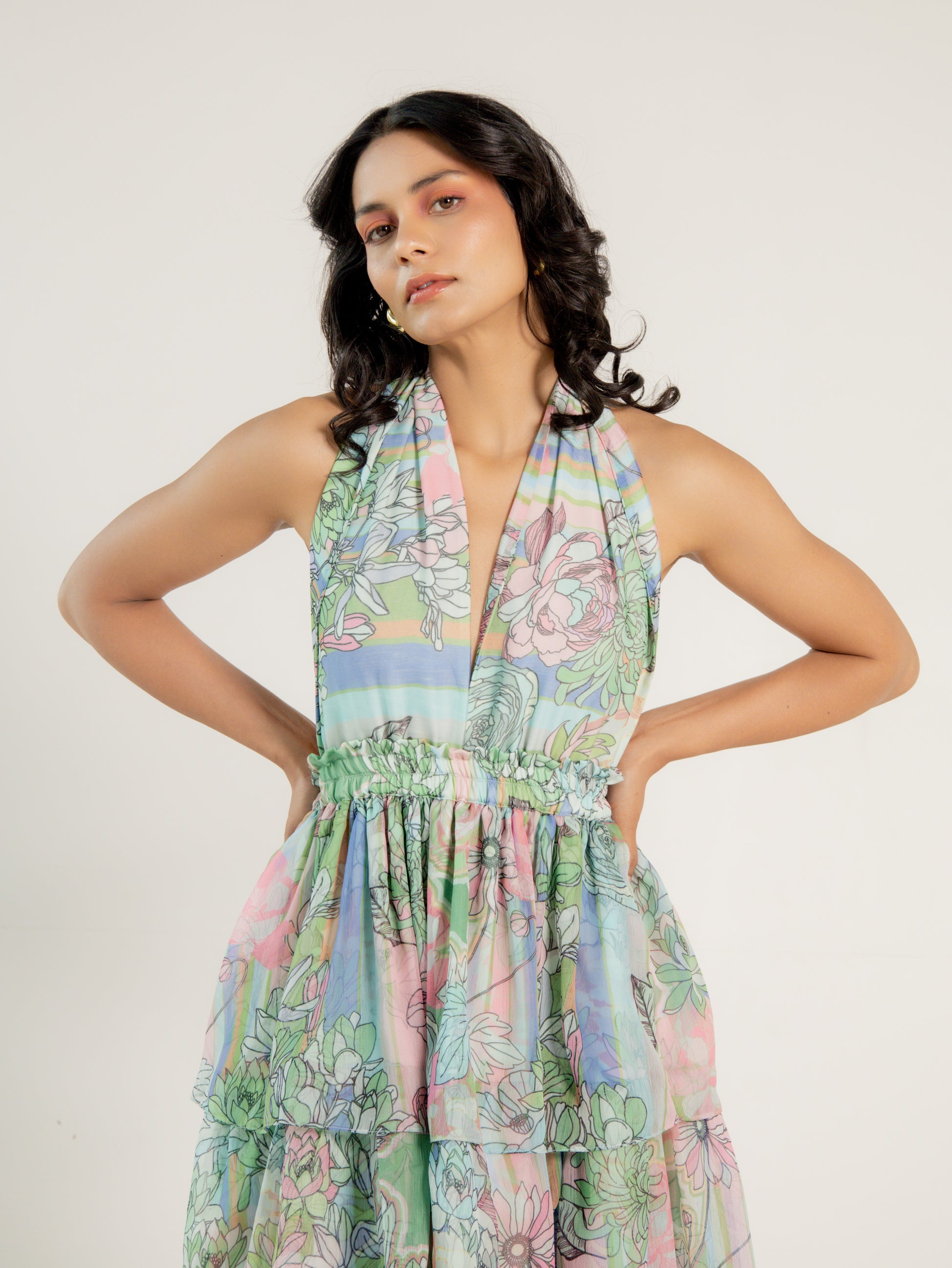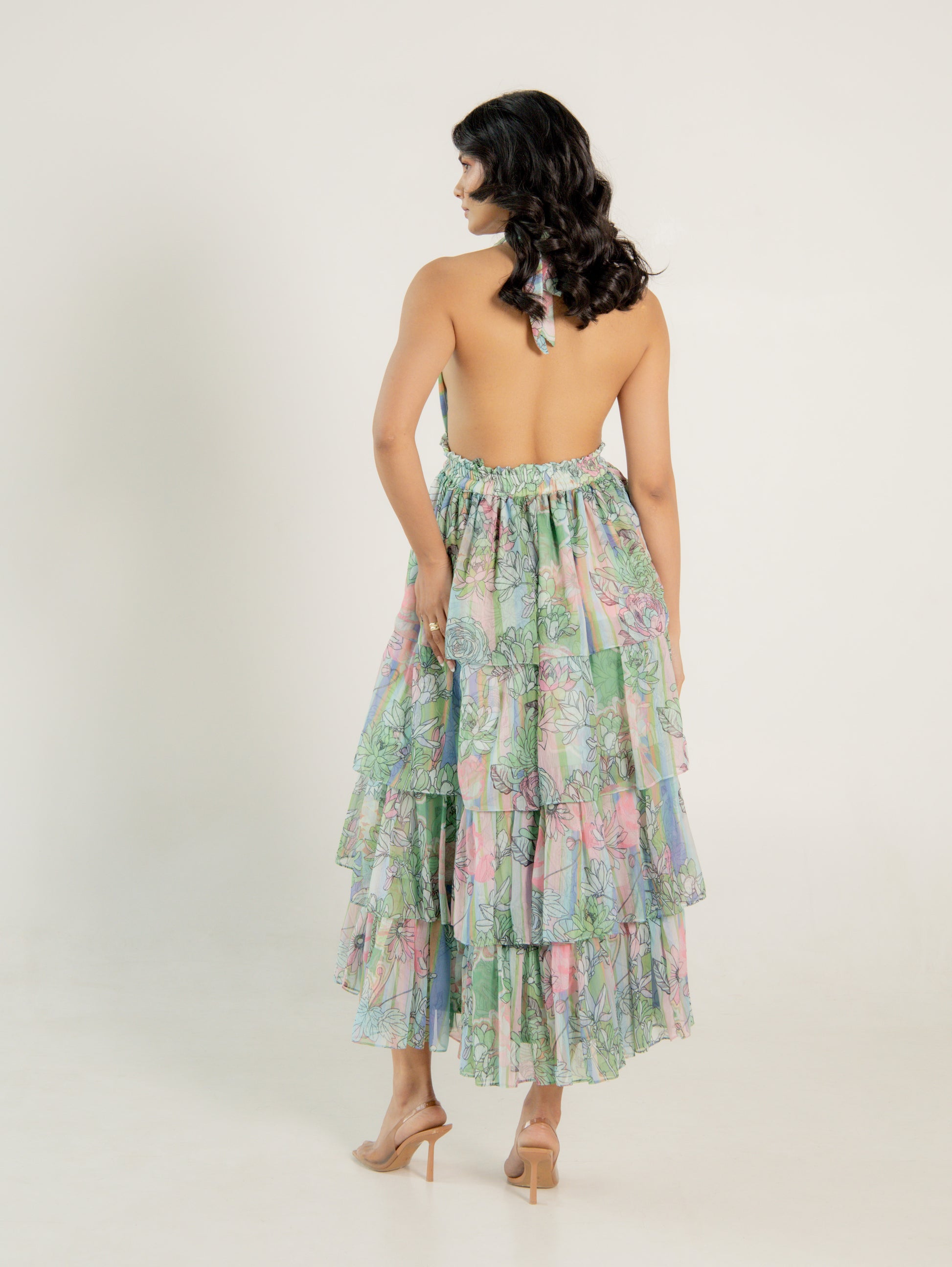 Backless dress with a playful ruffled skirt and a tie knot halter neck detail. Handcrafted in our fern print in sustainable chiffon fabric.