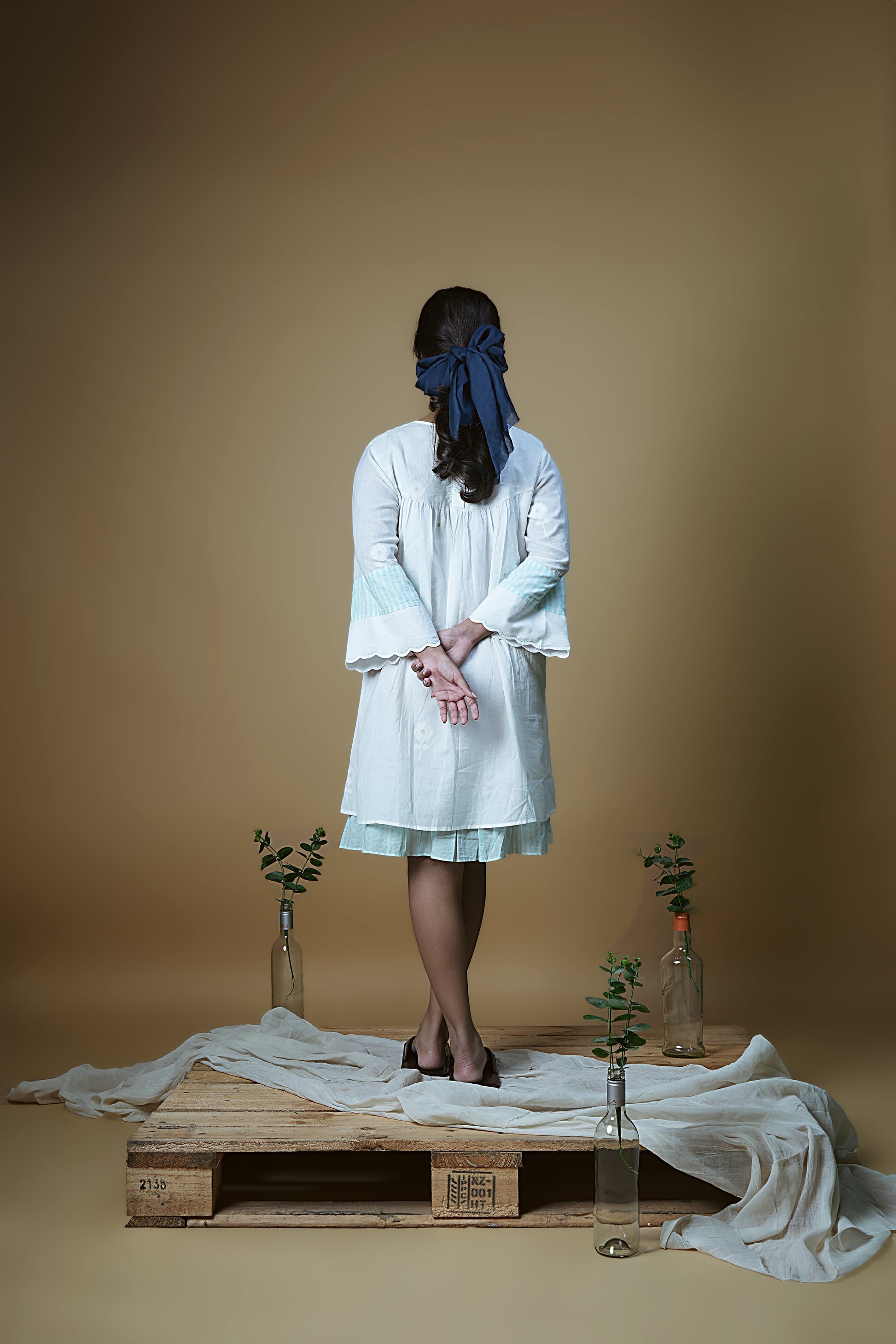 Handcrafted in the softest cotton Jamdani, this shirt dress is an absolute go-to-wear for any casual day. The outer dress is a loose fit whereas the slip in contrast colored checks come in the size you fit. The back of the shirt dress has pleats and lace detailing at the collar, back yoke, and sleeves.